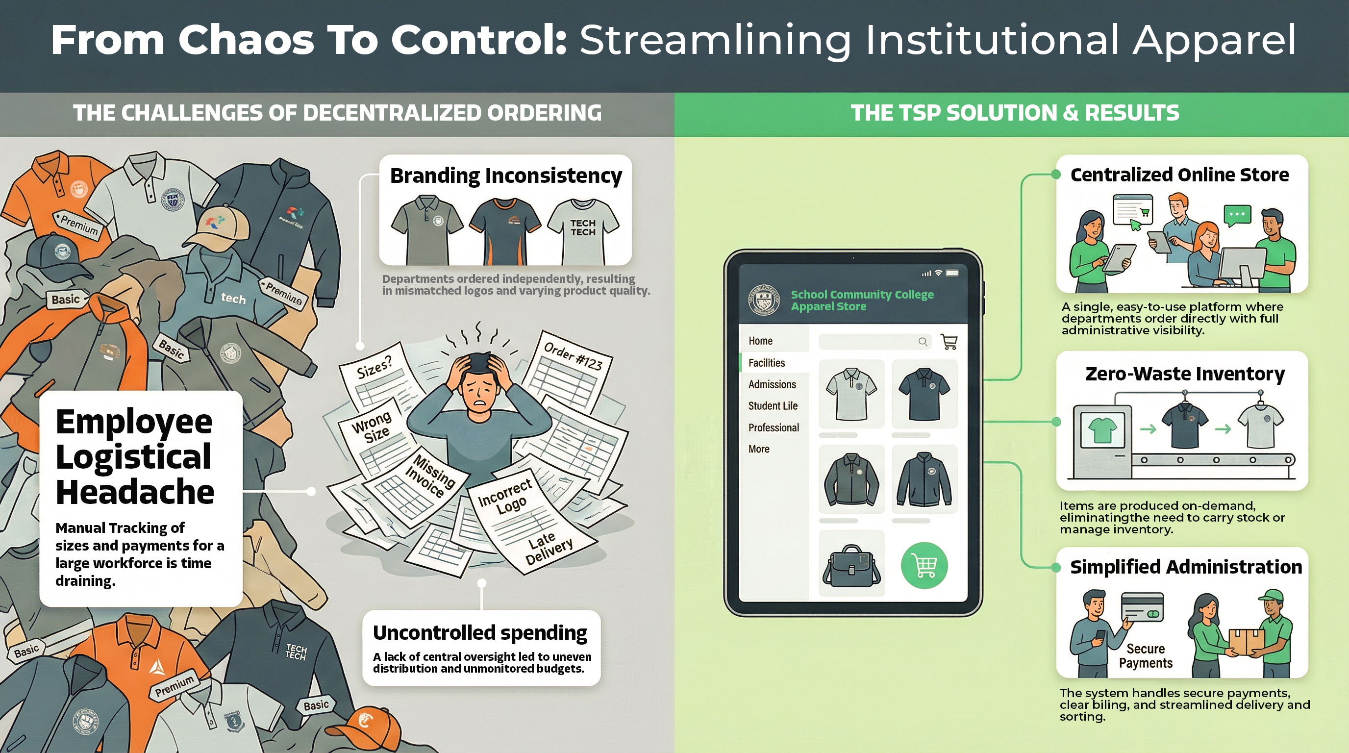 A company store is a custom-branded online store where your employees, team members, or customers can order pre-approved branded products. We handle the design, production, and fulfillment.